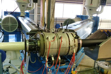基本構成與電纜擠出生產線相似,主要用于HDPE塑料, 用熱擠法對鋼纜芯進行護套層的擠出包覆。 最大直徑可達200mm,最大線密度可達170kg/米。